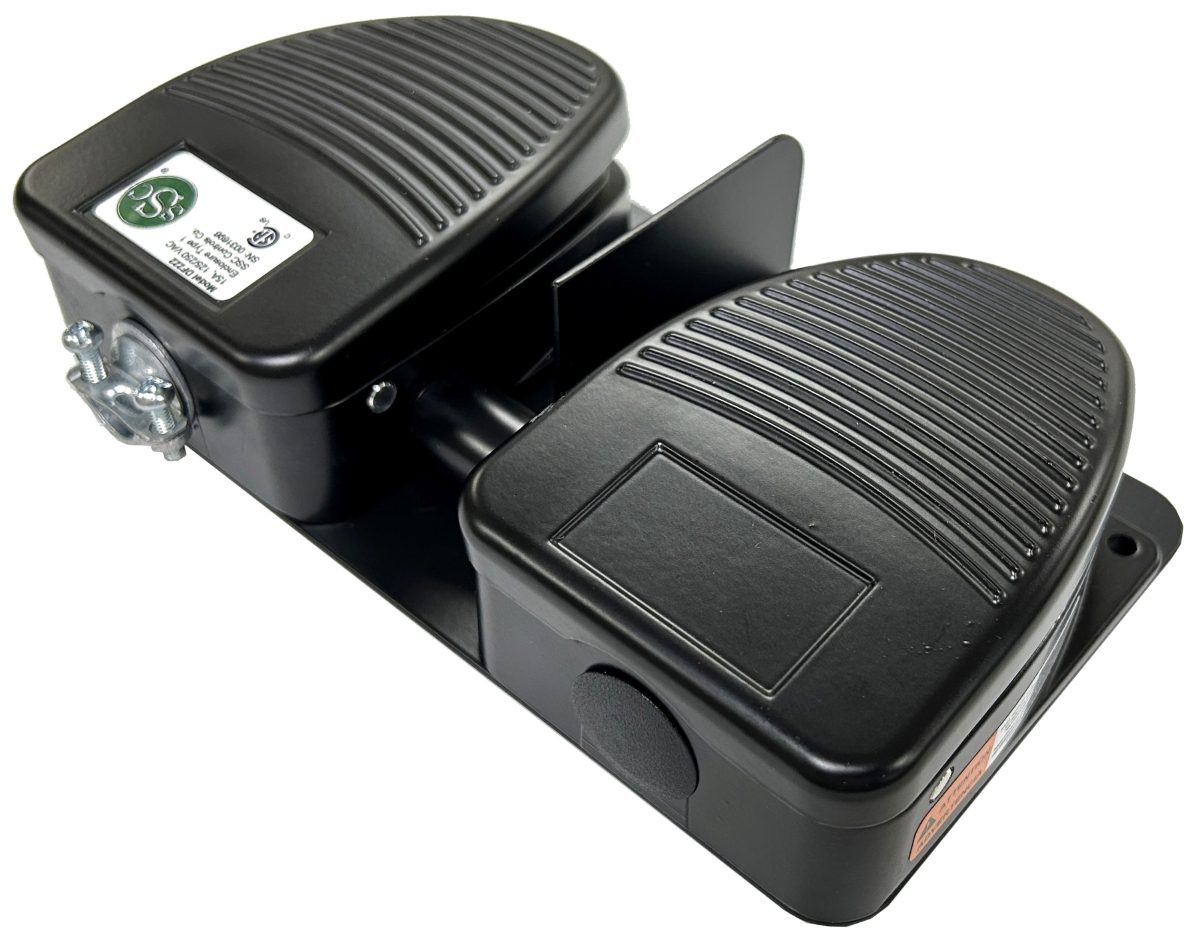 The DF500 is a dual foot switch with a connector tube to route the wiring from one side to the other, and it has a single cable exit point. The foot switches are mounted on a welded steel base with a center divider and bumper feet. Great for applications such as pipe rollers, scissor lifts, lift tables, positioners, twin pedal, up/down, and forward/reverse foot switch applications.